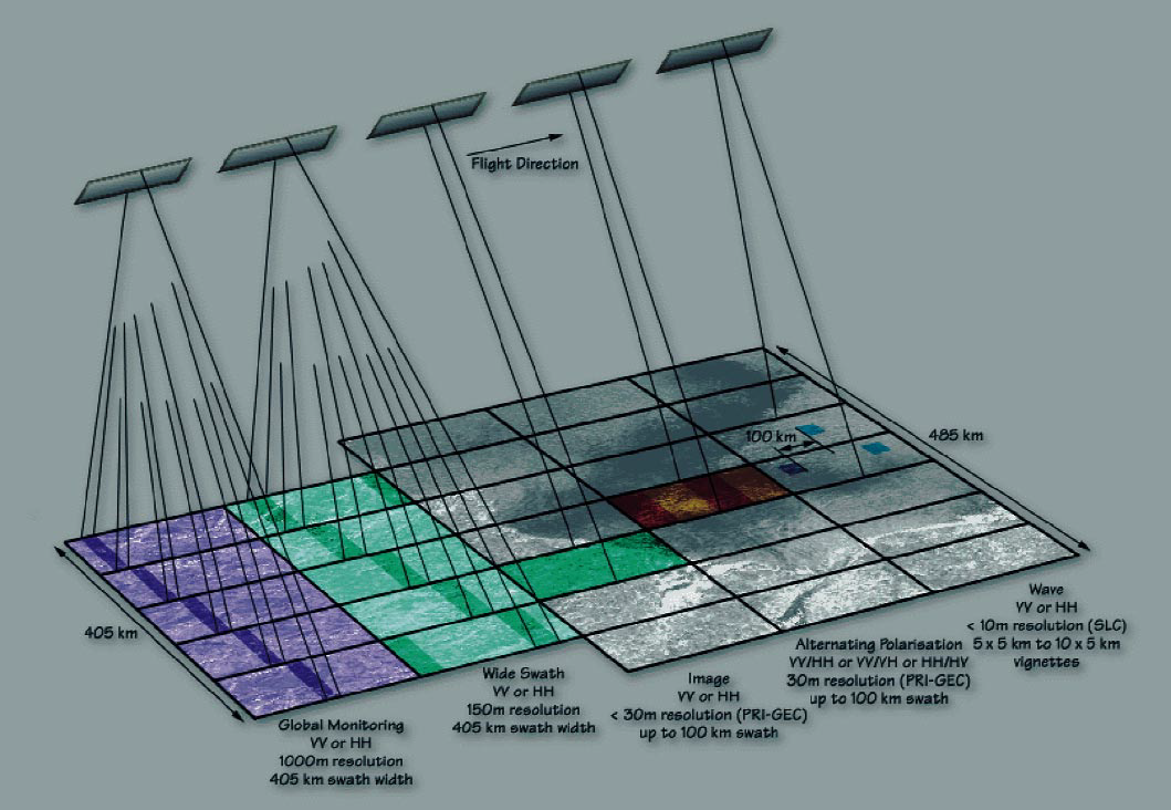- Swath Width: Image and alternating polarisation modes: up to 100km, Wave mode:5km, Wide swath and global monitoring modes: 400km or more